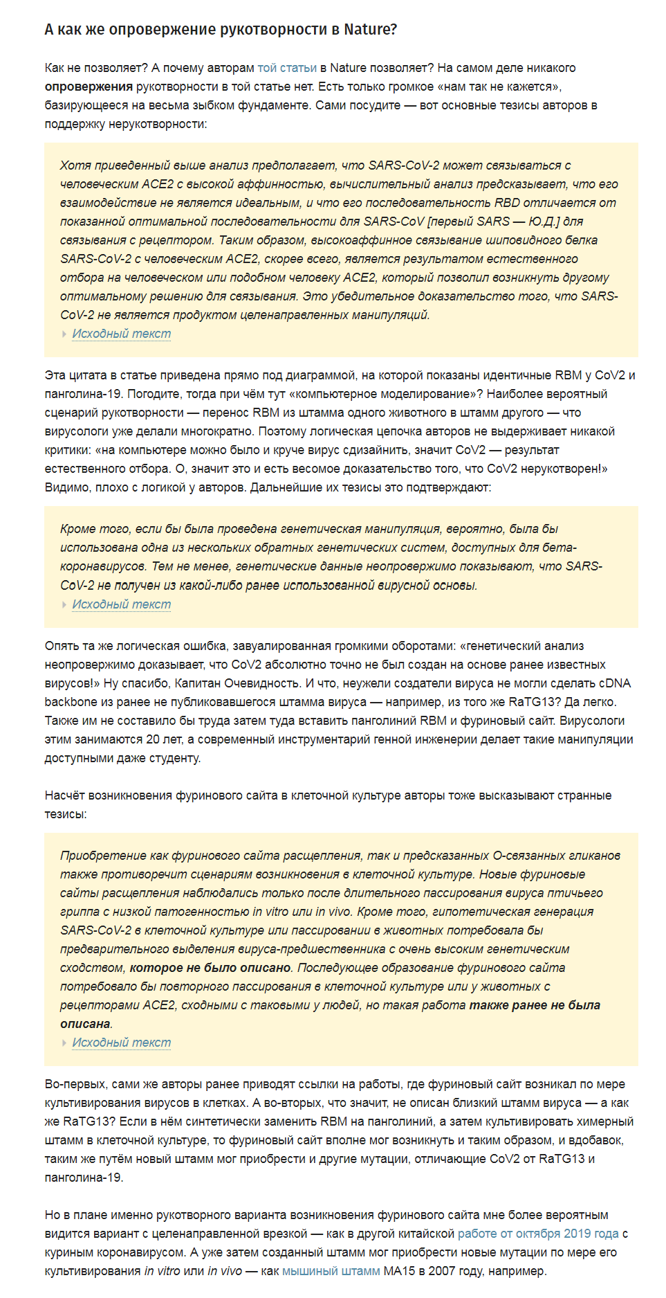 Date: 2020-04-20 04:33 pm (UTC)1. Предполагается, что последовательность вируса ВИЧ введена в коронавирус, чтобы он экспрессировал один из антигенов ВИЧ и служил "живой прививкой" от него. ОК, допустим это, такое вполне возможно практически (хотя и невозможно юридически в западном мире). Но это не означает, что именно эта вставка сделала вирус таким опасным, притом что сама "прививочная" цель работы требовала, чтобы он был безопасным. Возможно для интервьюера допущение о том, что именно вставка от ВИЧ сделала вирус опасным кажется естественным (он может наивно полагать, что раз ВИЧ опасен, то и опасна и вообще любая его часть). Но странно, что это, похоже, подразумевает и профессор (притом что в "прививочных" целях антиген должен быть безопасен для человека), поскольку говорит, что в ходе своей эволюции вирус стремится избавлиться именно от этой вставки. Меж тем общеизвестно и естественно, что эволюция любого опасного патогена идет в сторону снижения его опасности - это называется аттенюацией - как автоматическое следствие естественного отбора в ходе его распространения. Никакой паразит не заинтересован ни в смерти хозяина - так как погибает вместе с ним, ни в существенном вреде для его здоровья - так как это снижает его способность к распространению. Любая слишком опаснаяый инфекция возникает "по ошибке" - как правило при случайной смене хозяина (что предполагалось и для данного вируса), и "природа" (естественный отбор) всегда стремится снизить ее патогенность (аттенюация инфекции). Таким образом, вставка от ВИЧ (если она есть) - это одно и нечто шокирующая, а эволюция вируса в сторону снижения патогенности - это другое и вещь тривиальная. Если такая вставка действительно существует, она недвусмысленно указывает на происхождение вируса, но вряд ли имеет отношение к его высокой патогенности (и если имеет, то скорее всего также чисто случайным образом).